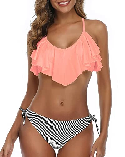 Be the center of attention in this stunning two piece flounce ruffled cross back bikini set that features a padded top, adjustable straps, and a high-cut, tie-side bottom.