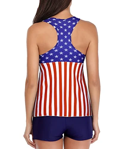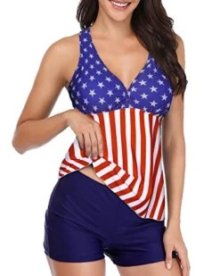 This two-piece v neck racerback tankini swimsuit set features removable padded push-up tank top bras, racerback, and boyshorts, providing full coverage and tummy slimming while still being sporty and flattering.