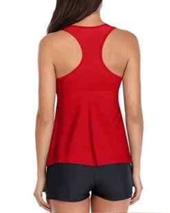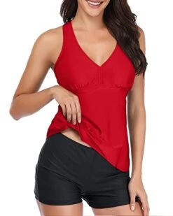 This sporty and chic two-piece V neck racerback tummy control tankini bathing suit features shirred swim tops, boy shorts, and a comfortable, flowy tank top.