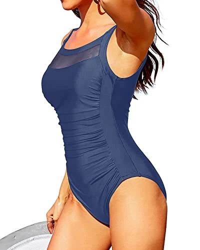 With its wide shoulder straps and padded push-up bra, our swimsuit offers both comfort and support, allowing you to swim with confidence. The combination of a see-through mesh round neck, U-back design, and ruched tummy control creates a stunning, slimming effect, making it a perfect choice for beach parties, vacations, or your honeymoon in Hawaii.