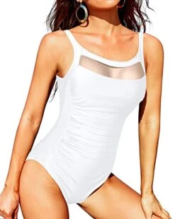 Show off your feminine curves with this one piece mesh vintage swimsuit featuring a padded push-up bra and ruched tummy control.