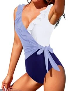 Wrap 1 piece bathing suits with adjustable tie side bowknot allow to adjust the tightness at will, long torso high cut swimwear with low cut and high waist tummy control design provides a great fit and full coverage to your belly. Feminine falbala ruffled hem high waisted monokini is modest but very chic and flattering, which elevates your beach style and make you looks more elegant and charming.