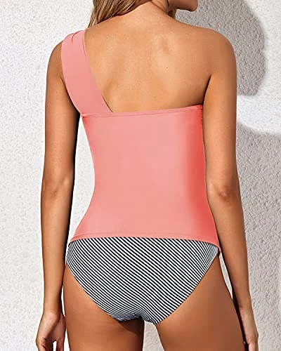 Make a statement in this backless two piece one shoulder tankini set, designed to be both sexy and comfortable for all-day wear.