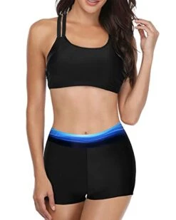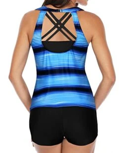 Blue backless tankini top with criss cross back design and tummy control boy shorts make for a chic and sexy beach vacation outfit.