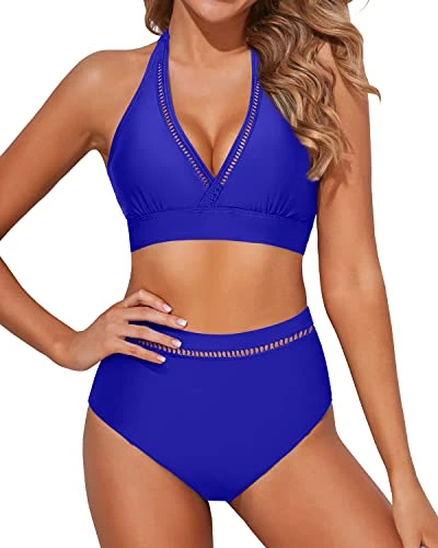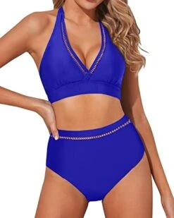 This two-piece swimsuit set for women features a high-waisted bikini bottom with tummy control, a mesh push-up halter top with a removable padded bra for support and shape, and is made of quick-drying, stretchy, and comfortable fabric, perfect for beach parties, pool parties, and other water activities.