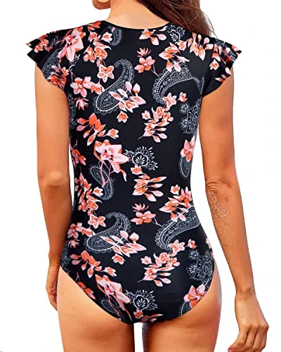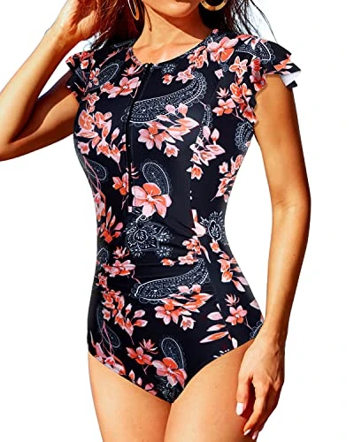 Stay stylish and protected with these versatile one piece bathing suits, perfect for surfing, swimming, and other water sports, featuring a convenient zip front and cute ruffle cap sleeves on the short sleeve rash guard.